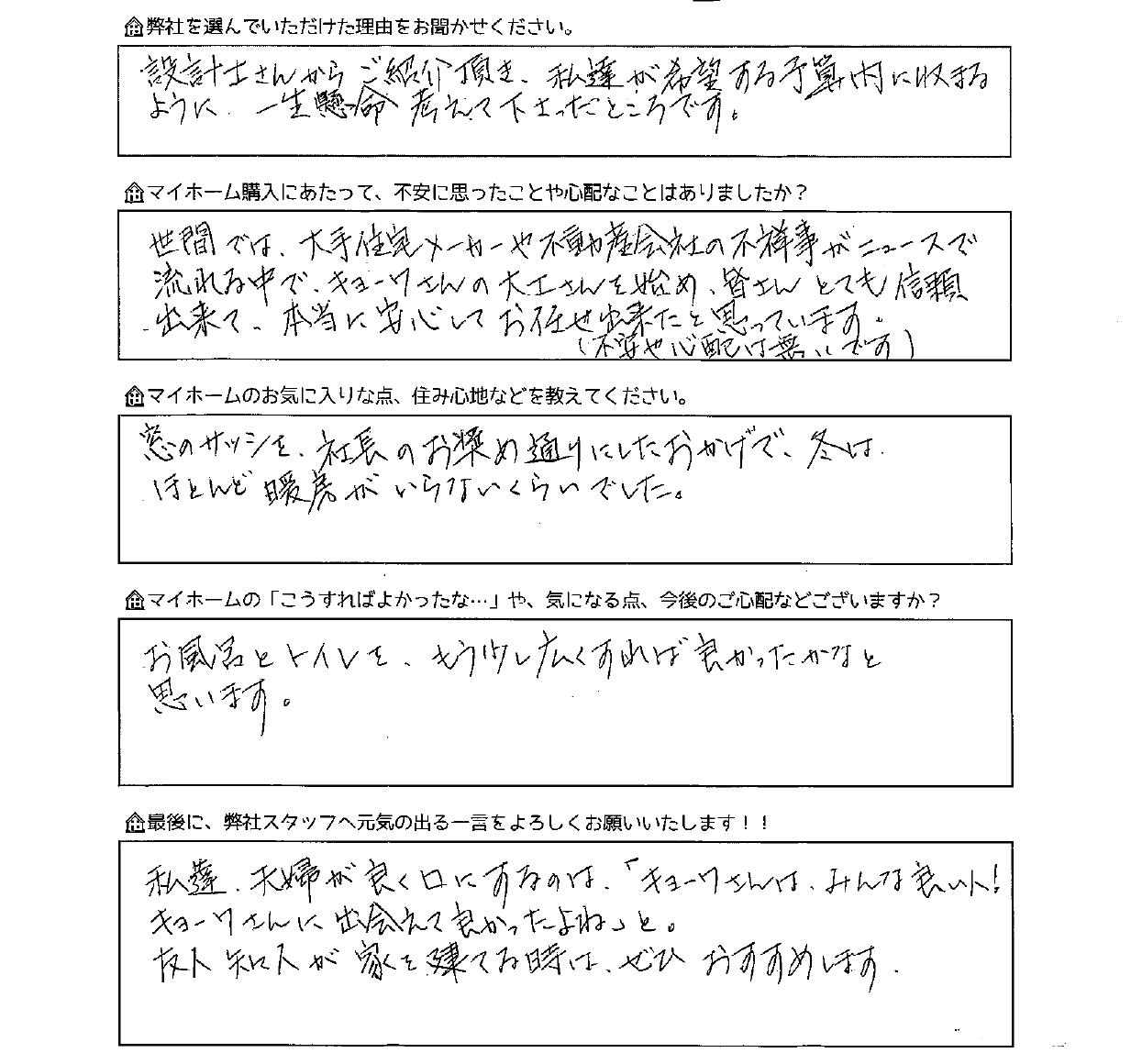 世間では。大手住宅メーカーや不動産会社の不祥事がニュースで流れる中で、キョーワさんの大工さんを始め皆さんとても信頼出来て、本当に安心してお任せ出来、不安や心配はありませんでした。