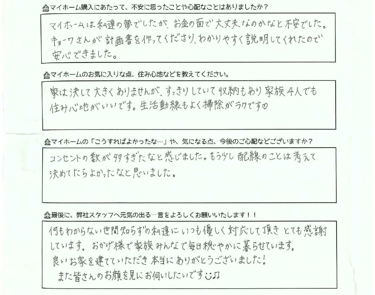マイホームは私達の夢でしたが、お金の面で大丈夫なのかなと不安でしたが、キョーワさんが計画書を作ってくださり、わかりやすく説明してくれたので安心できました。家は決して大きくありませんが、すっきりしていて収納もあり家族4人でも住み心地がいいです。生活動線もよく掃除がラクです♡コンセントの数が多すぎたなと感じました。もう少し配線のことは考えて決めたらよかったなと思いました。